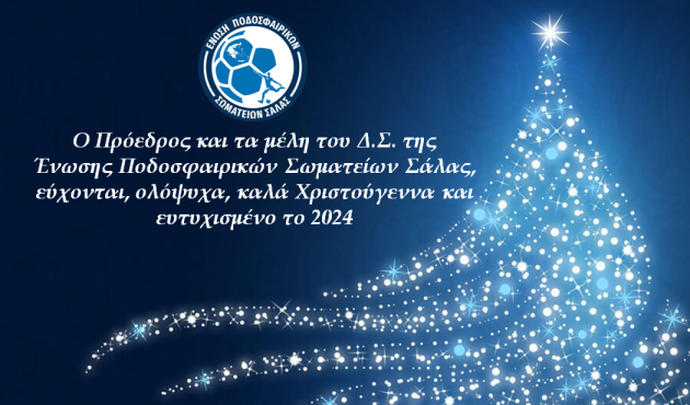 Η ΕΠΣ Σάλας στέλνει τις πιο θερμές ευχές της στα σωματεία-μέλη της, στους αθλητές και στις αθλήτριες, στους προπονητές και στις προπονήτριες, καθώς και σε όλους τους συντελεστές του ελληνικού ποδοσφαίρου σάλας, για καλές γιορτές και ένα δημιουργικό 2024, με υγεία, αγάπη, σεβασμό και περαιτέρω ανάπτυξη του όμορφου αθλήματός μας.
