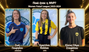 Η δέκατη και τελευταία κατηγορία βραβείων Futsal Awards που το epssalas.gr συνεχίζει παρουσιάζει ενόψει της εκδήλωσης της Βασιλόπιτας της ΕΠΣ Σάλας, την Παρασκευή 21/2, είναι η ΠΟΛΥΤΙΜΟΤΕΡΗ ΠΑΙΚΤΡΙΑ “MVP” WOMEN’S FUTSAL CHAMPIONSHIP 2023-24. Οι υποψήφιες (για τις οποίες υπενθυμίζουμε αναδείχθηκαν μετά από την ψηφοφορία) είναι σε αλφαβητική σειρά: Ζωή Γεωργίου (Ηνίοχος), Χριστίνα Κόλλια (ΑΕΚ) και Ελένη Όλγα Στεφάτου (ΑΕΚ). Η ανακοίνωση και η βράβευση της νικήτριας θα γίνει στο πλαίσιο της εκδήλωσης της βασιλόπιτας της ΕΠΣ Σάλας.